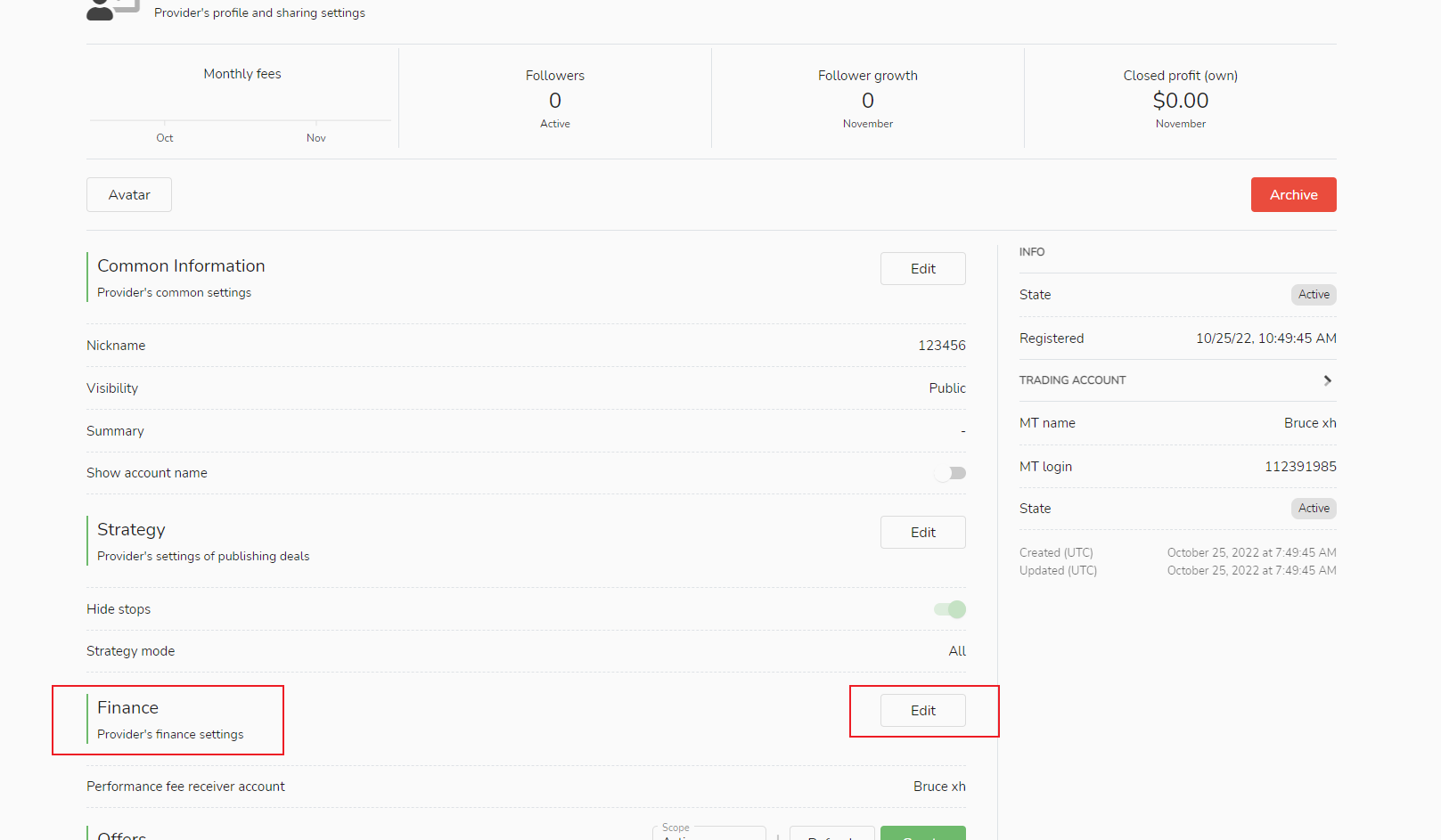 1. Under the "My Signal Sources" column, select "Performance Fee Receiver Account Settings" and click the "Edit" button.