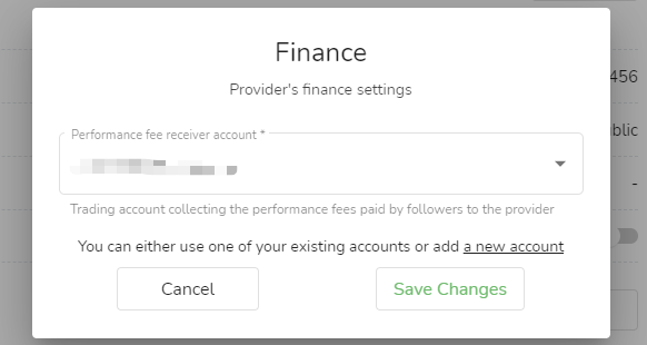 2. In the pop-up window, select the account that you want to receive the performance fee, and click "Save Changes".