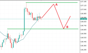 c) Cuando el precio del USDJPY toca la línea A a la baja, se activa la orden Sell Limit en la línea B, y cuando el precio rebota de la línea A a la línea B, se ejecuta una orden Sell al precio de la línea B;