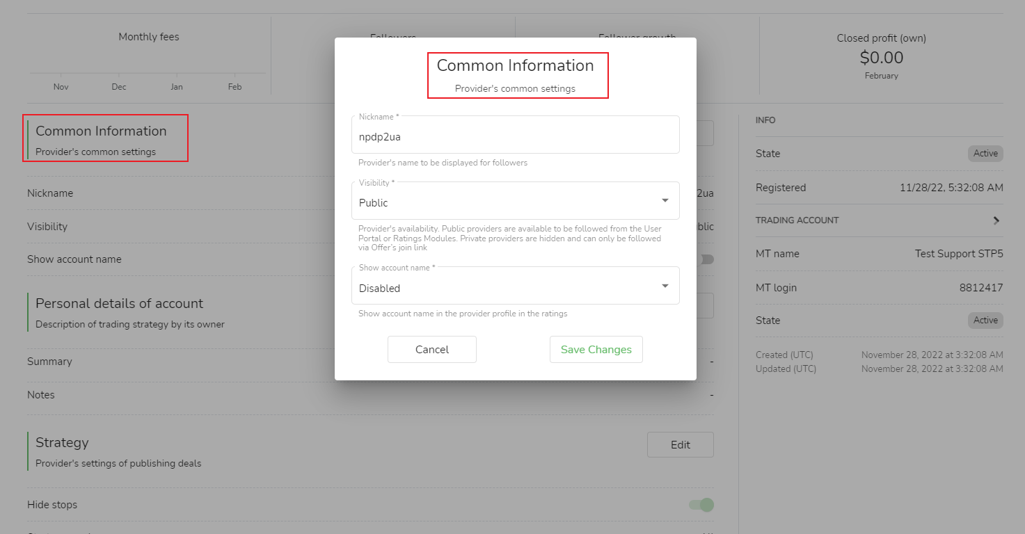 실적 수수료 수락 계정:시그널 소스가 팔로워를 모아 시그널 소스에 성과 수수료를 지불하는 거래 계정은 기존 계정을 선택하거나 새 계정을 추가할 수 있습니다.새 계정을 추가하는 과정에서 거래 계정(즉, MetaTrader의 거래 계정) 및 암호(즉, MetaTrader 거래 암호)를 입력한 다음 [변경 사항 저장]을 클릭하면 성공적으로 설정이 완료됩니다.
